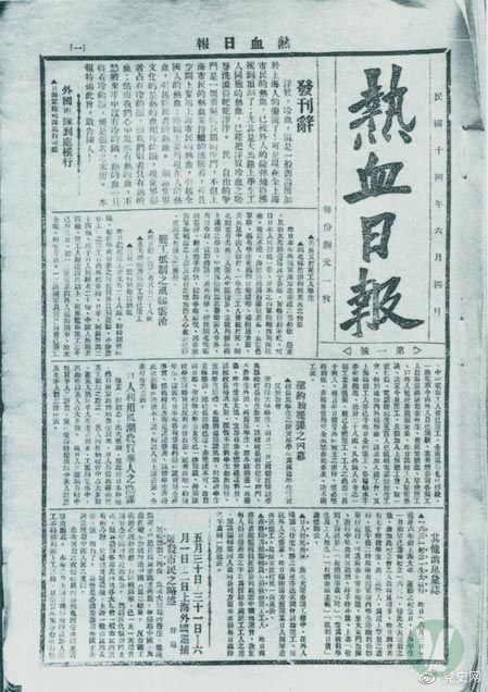 6月4日 中國(guó)共產(chǎn)黨歷史上的第一份日?qǐng)?bào)《熱血日?qǐng)?bào)》創(chuàng)刊,由瞿秋白主編。這份通俗的政治性小型報(bào)紙,每天出版8開(kāi)4版一張?!稛嵫?qǐng)?bào)》在密切配合政治斗爭(zhēng)、及時(shí)宣傳報(bào)道上海和全國(guó)各地反帝反封建的群眾愛(ài)國(guó)運(yùn)動(dòng),堅(jiān)持正確輿論導(dǎo)向和戰(zhàn)斗性的同時(shí),還注重文章的通俗性、群眾性和形式的多樣性,讓一般的工人和市民群眾都能看懂?!稛嵫?qǐng)?bào)》只出了24期,6月29日就被租界巡捕房查封而??K谥袊?guó)現(xiàn)代革命史和新聞史上寫下了光輝的一頁(yè)。